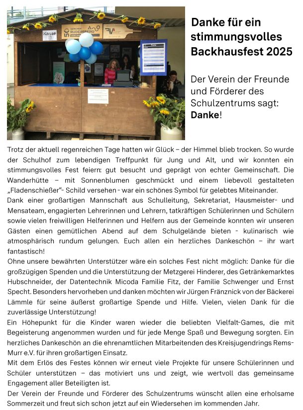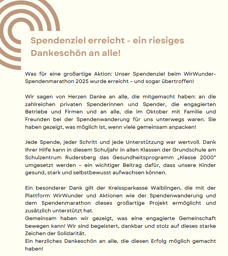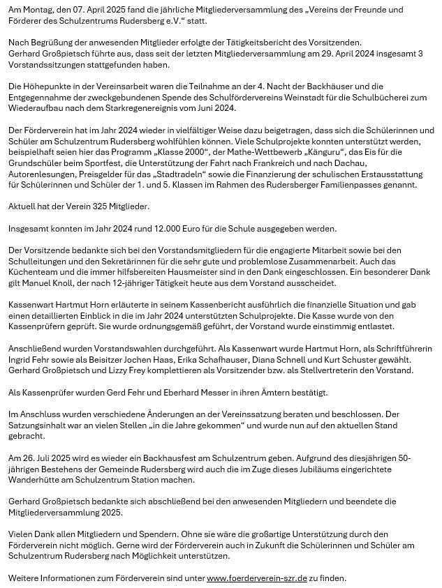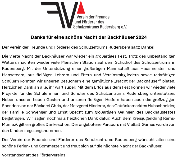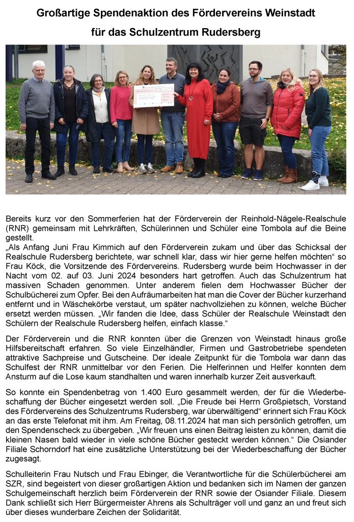 Hochwasser Rudersberg Veröffentlicht am 06/06/2024 von ElisabethFrey 449 ZENTRALES SPENDENKONTO FÜR BETROFFENE DES HOCHWASSERS EINGERICHTET Die Gemeinde Rudersberg hat ein Spendenkonto eingerichtet, um für vom Hochwasser betroffene Bürgerinnen und Bürger unterstützen zu können. Gespendet werden kann auf dieses Konto: Gemeinde Rudersberg Spendenkonto „Starkregen“ DE42 6025 0010 0015 2229 69 SOLADES1WBN